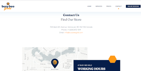 Because dry cleaning and tailoring are very local services, it’s key that a good site remembers that the internet is a worldwide medium, and draws the reader down to where the company actually exists. Busy Bee does a good job of this, not only with its full address, phone and other contact information, but with a map of the Vancouver area, and a custom-made locator balloon with the company’s logo on it. The hours the store is open are displayed right with the map for easy comprehension.