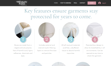 The Treasury Boxes site, as a separate entity, doesn’t continue the colour palette, but includes the same straightforward language and is designed to answer customer questions so they can order with confidence. It’s clear the same hand was at work designing it, as it again utilizes the 1, 2, 3… system of conveying snippets of important information the customer will want to know about the boxes.